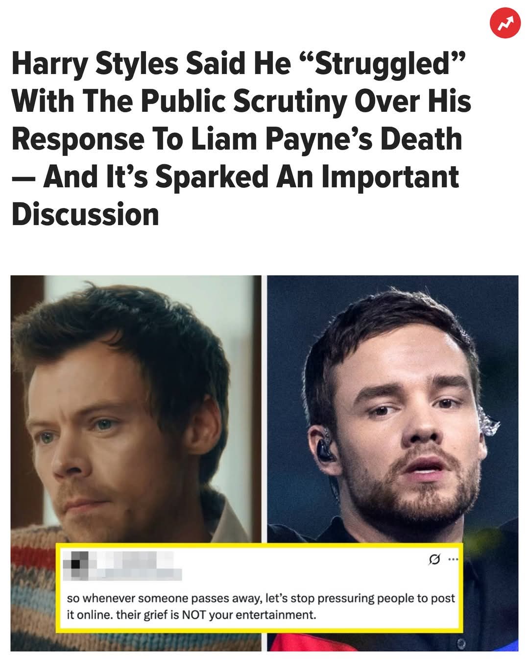 “Full transparency… Even the idea of talking about it, I struggle with that,” Harry said when Zane Lowe mentioned Liam during a new Apple Music interview. “I think there was a period when he passed away where I really struggled with acknowledging how strange it is to have people kind of own part of your grief in a way.”