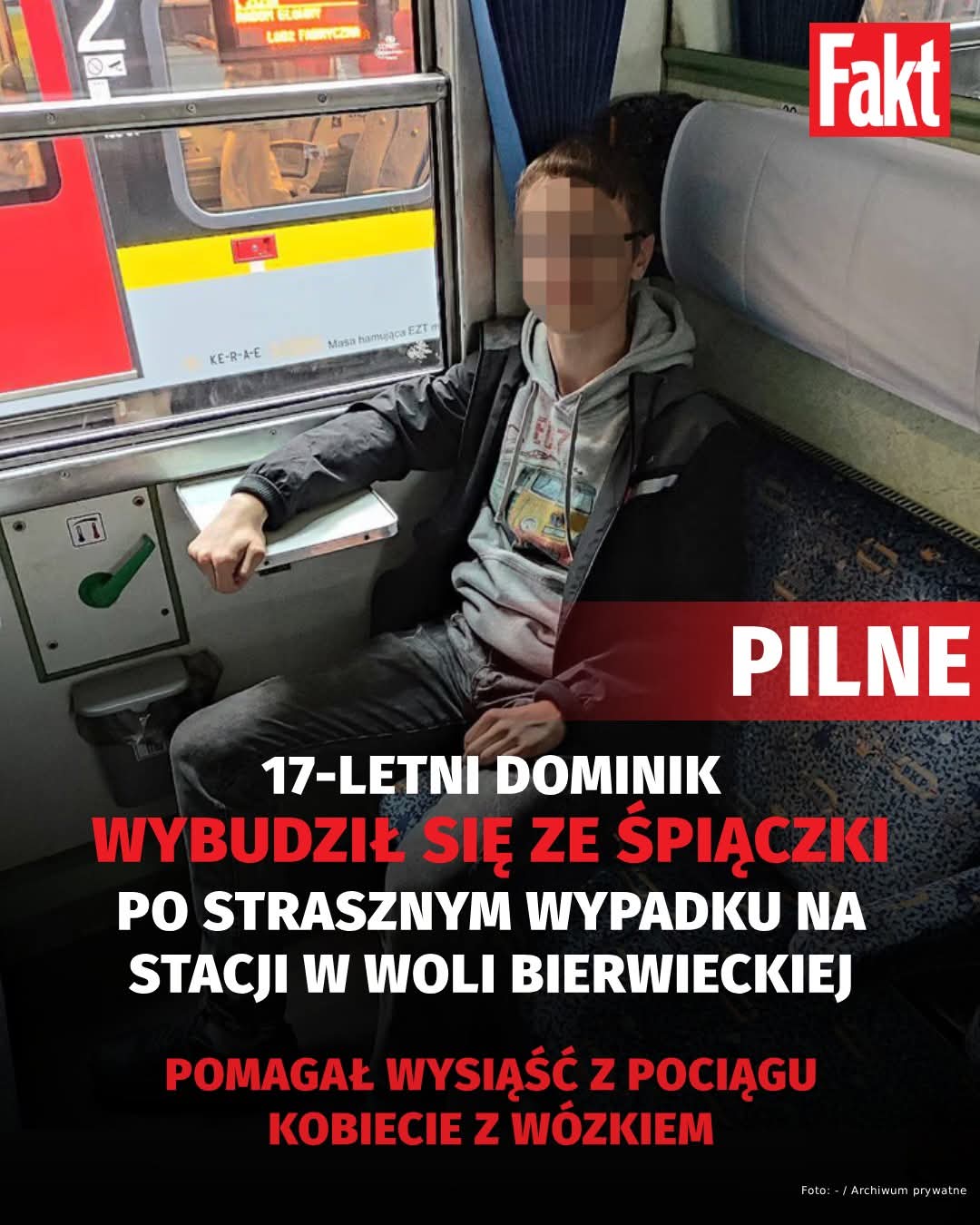 17-letni Dominik wybudził się ze śpiączki — przyznał “Faktowi” tata nastolatka. Ta wiadomość to wielki przełom i promyk nadziei w walce o powrót nastolatka do zdrowia. Chłopiec przez ponad miesiąc walczył o życie po strasznym wypadku, jakiemu uległ na stacji kolejowej w Woli Bierwieckiej (woj. mazowieckie). Nastolatek pomagał wysiąść z pociągu kobiecie z wózkiem, a gdy chciał wrócić do wagonu, drzwi przytrzasnęły mu rękę i został wciągnięty pod ruszający skład.