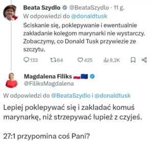 Jego nagranie wywołało lawinę komentarzy m.in. na portalu X. Jedną z komentujących osób była Beata Szydło, która pełniła funkcję prezes Rady Ministrów w latach 2015-2017. „Ściskanie się, poklepywanie i ewentualnie zakładanie kolegom marynarki nie wystarczy. Zobaczymy, co Donald Tusk przywiezie ze szczytu” – napisała w drwiący sposób. Z całą pewnością nie spodziewała się jednak, że na jej wpis zareaguje posłanka Koalicji Obywatelskiej Magdalena Filiks. Jej wpis, który zyskał już blisko dwa tysiące polubień i zrobił tym samym olbrzymią furorę możecie zobaczyć poniżej.